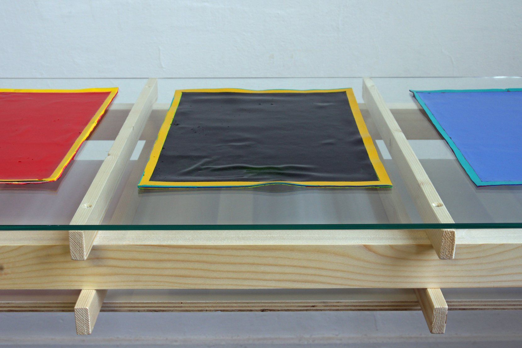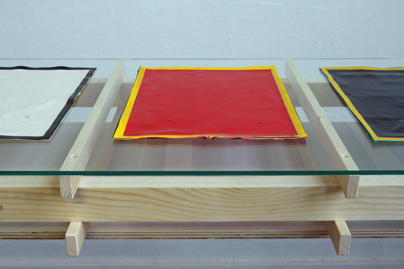 The table, part of this installation with five "Fifth Monochromes", is loosely based on Gerrit Rietveld's Military Table.